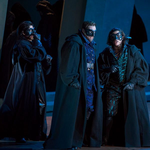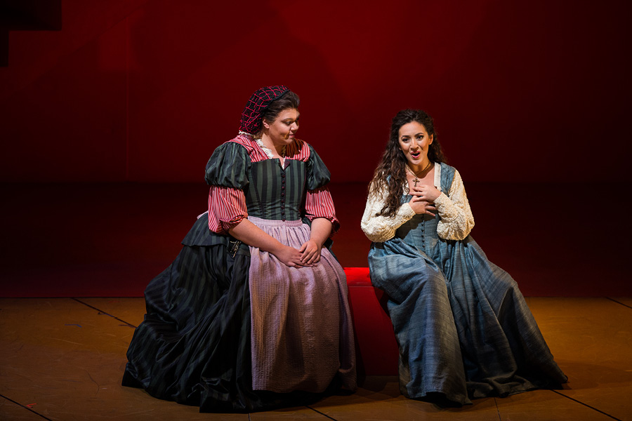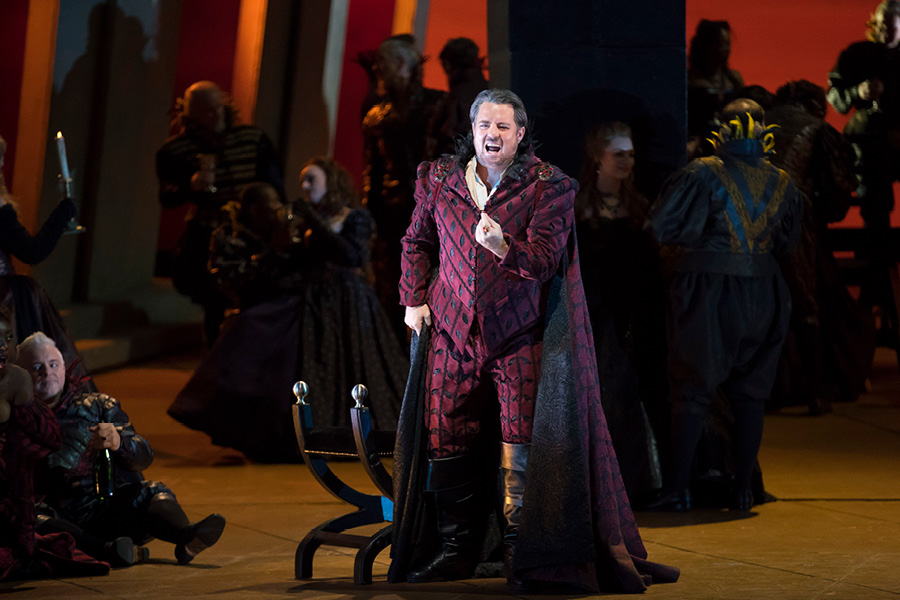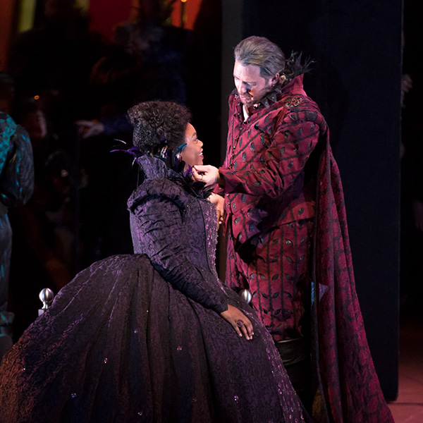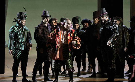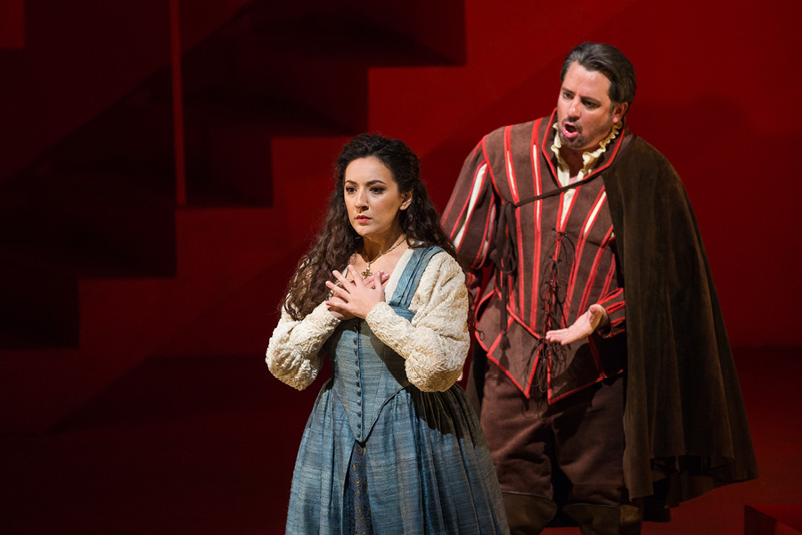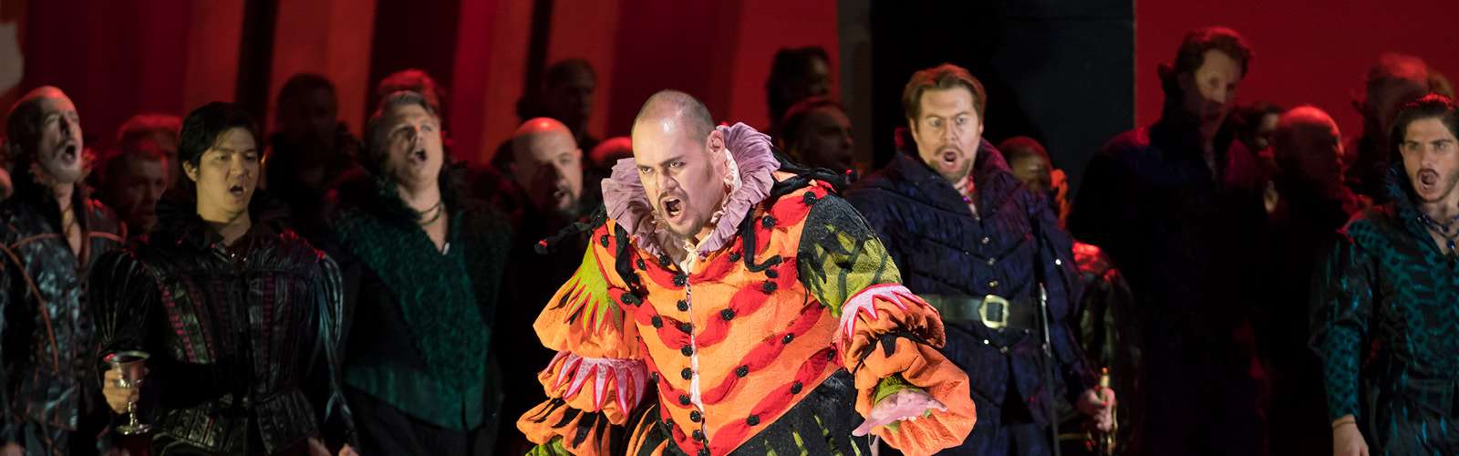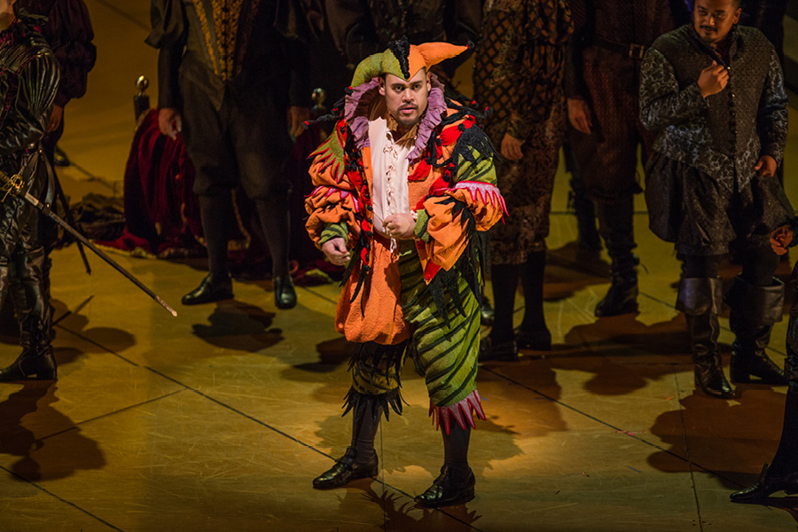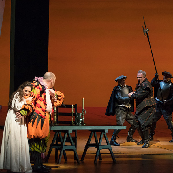 The Duke of Mantua boasts to a courtier, Borsa, about his most recent infatuation. A girl has enchanted the Duke, but ultimately it makes no difference to him whether he pursues one woman or another. Wishing to select one with whom to spend the evening, he surveys the court and settles upon the Countess Ceprano just as the court jester Rigoletto mocks her husband. Another courtier, Marullo, arrives with surprising news to share with his fellow courtiers: Rigoletto has a mistress. In the meantime, the Duke and Rigoletto discuss several unscrupulous methods of disposing of superfluous husbands. Realizing that he is the object of Rigoletto’s sarcasm, Count Ceprano arranges for a midnight meeting with some of the courtiers to obtain vengeance. The party is interrupted by the arrival of the nobleman Monterone, who storms in to denounce the Duke for dishonoring his daughter. He curses the Duke, and when mocked viciously by Rigoletto, Monterone turns on the jester and curses him as well.