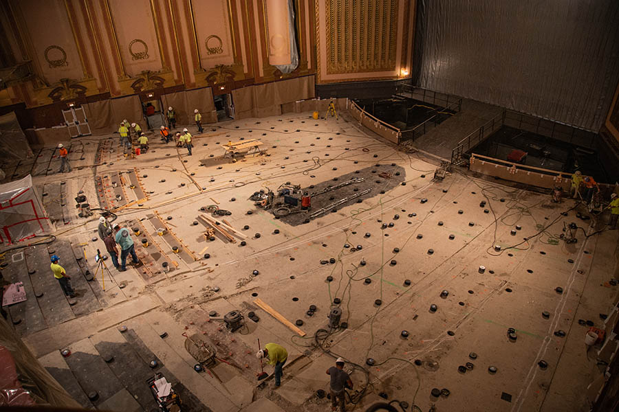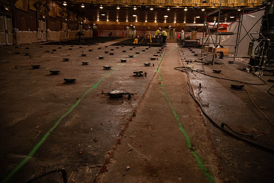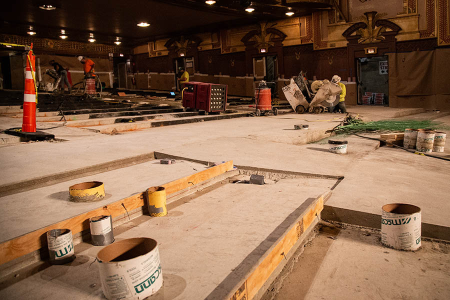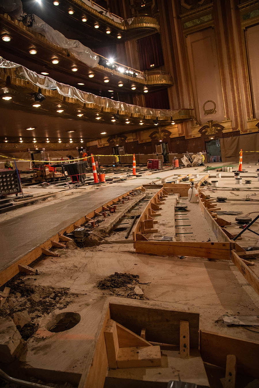 Our concrete contractors drilled holes for updated electrical wiring and our new HVAC return air vents. With that complete, they began re-sculpting the main floor aisles and leveling out the surface using a customized concrete formula poured into prepared wooden frames. The main floor cross-aisle (formerly Row AA) was moved toward the back of the theater and four rows near the stage were adjusted to bring the slope of the lower portion of the theater to the necessary height.
