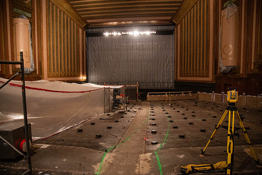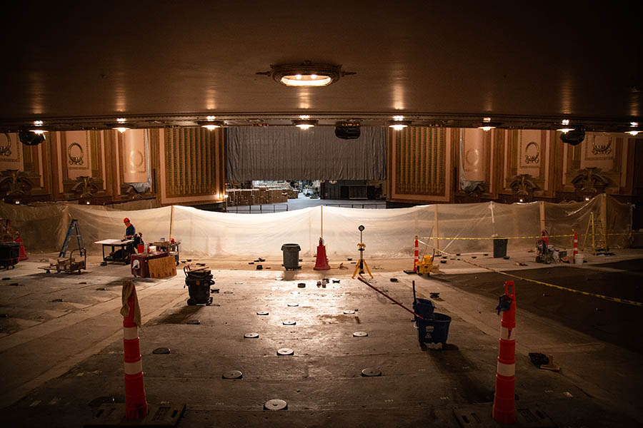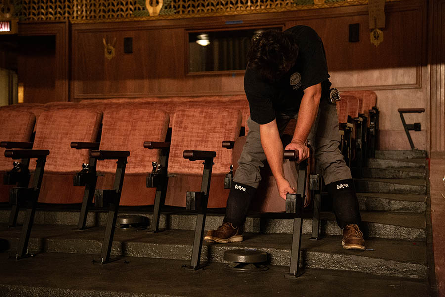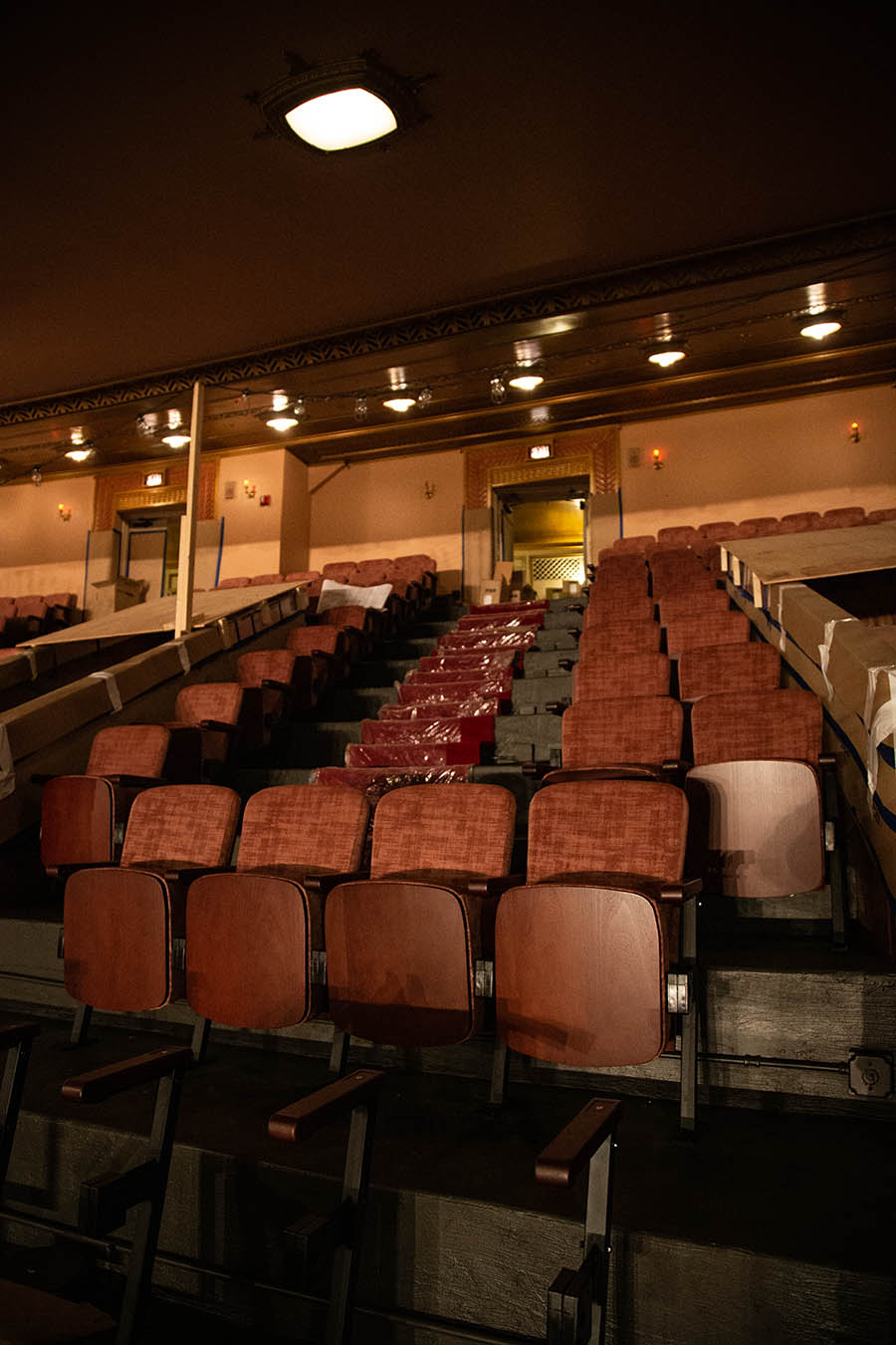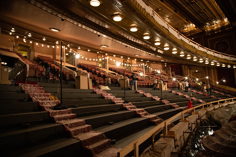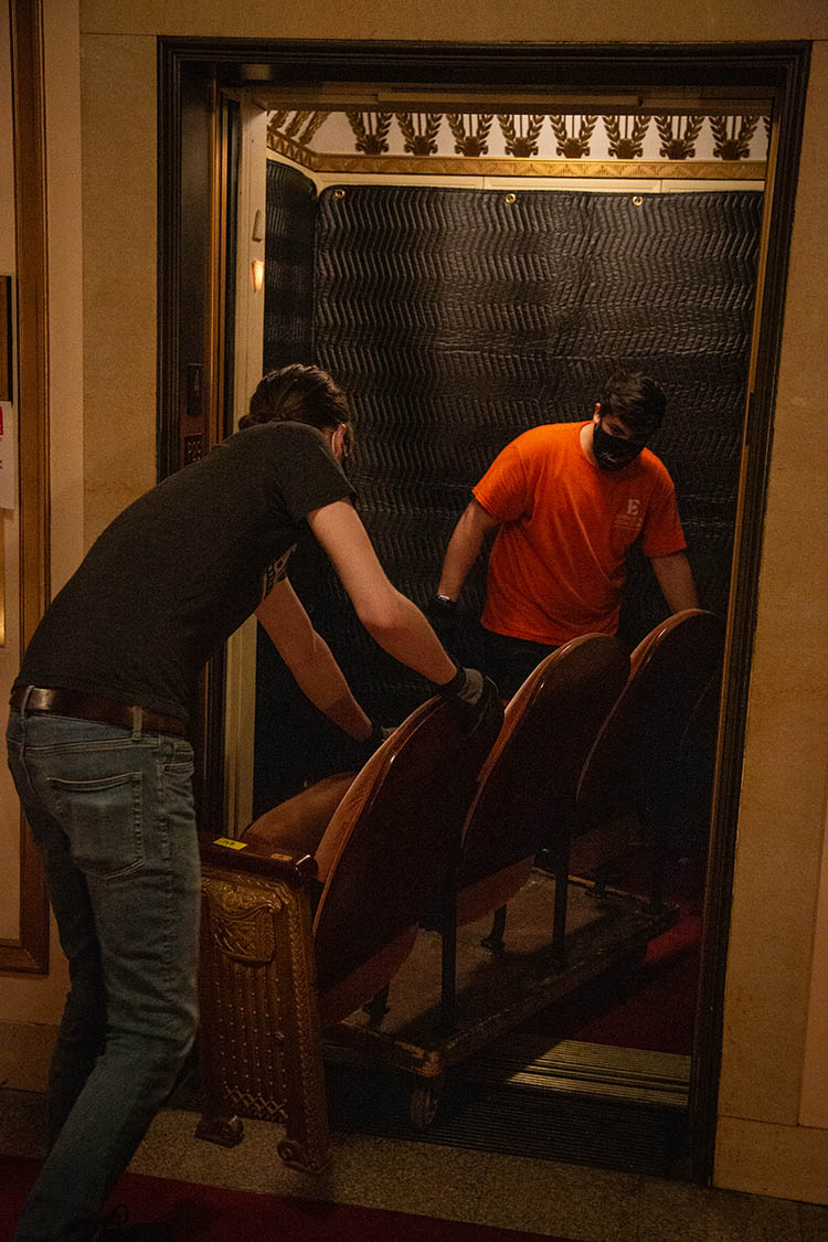 As our stagehands completed the removal of the old seats from the theater, Bully & Andrews personnel began erecting protective barriers throughout the theater. All lobby floors, stairways, and walls were covered. Further, all brass fixtures were protected with bubble wrap, all artwork was removed and safely stored, and all light fixtures had their glass covers removed and stored by our stagehands for protection.