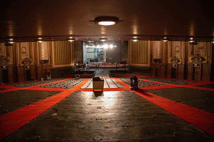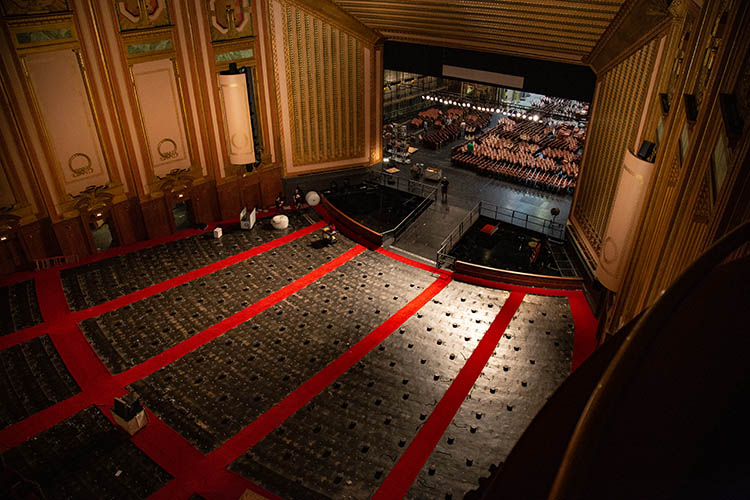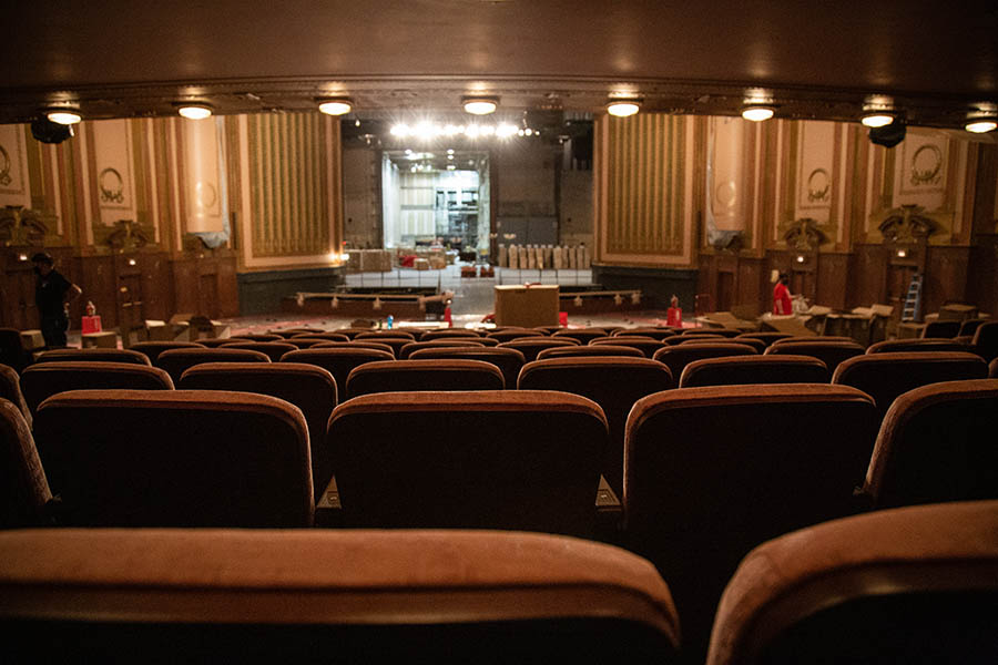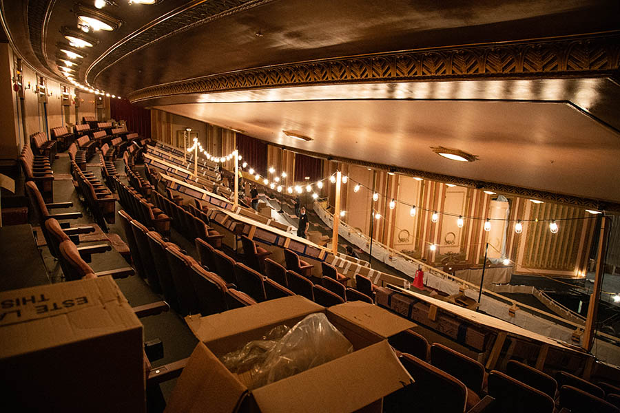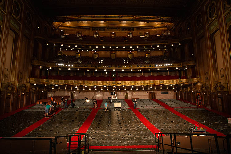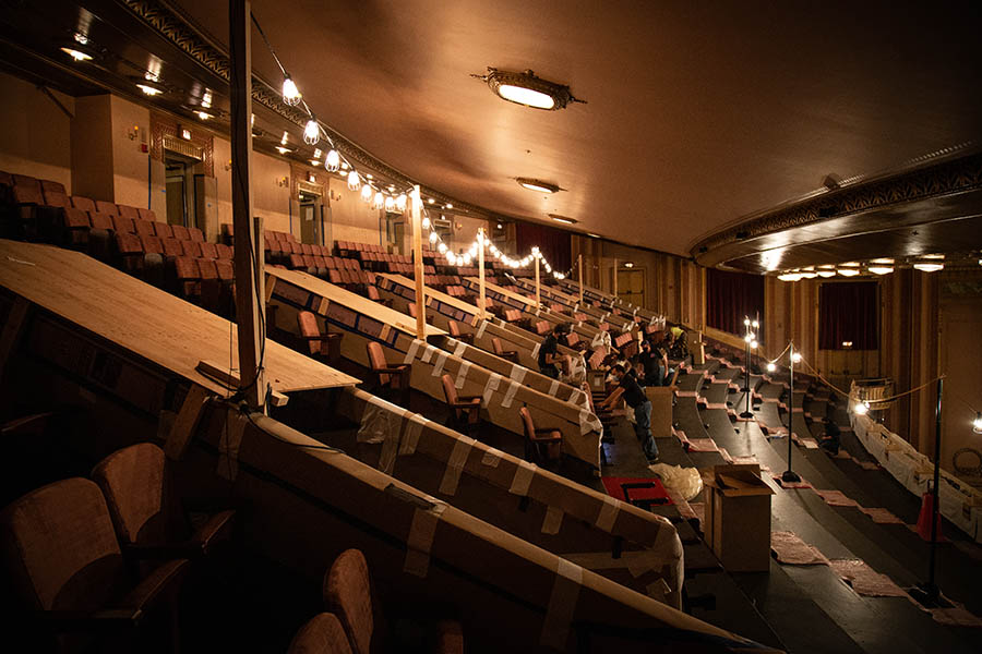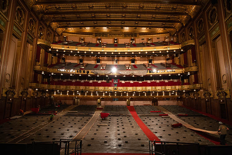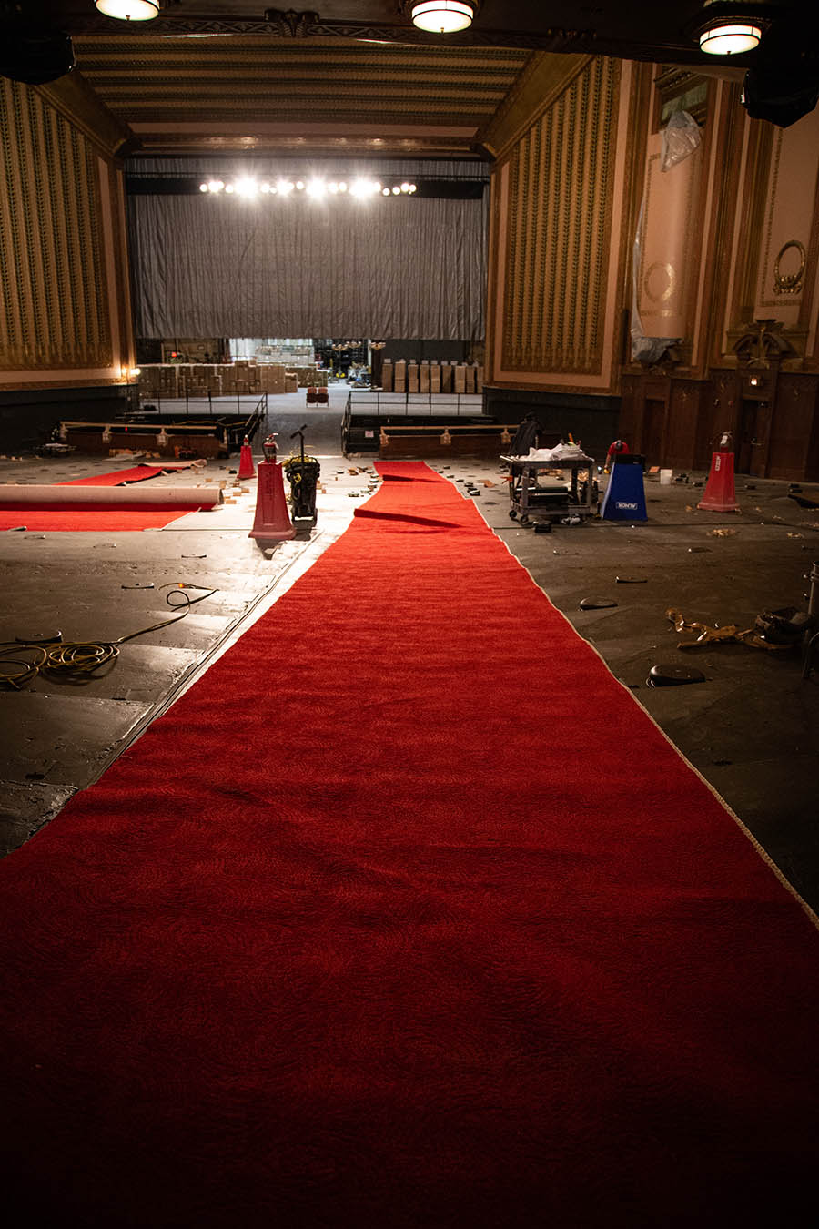 As our stagehands completed the removal of the old seats from the theater, Bully & Andrews personnel began erecting protective barriers throughout the theater. All lobby floors, stairways, and walls were covered. Further, all brass fixtures were protected with bubble wrap, all artwork was removed and safely stored, and all light fixtures had their glass covers removed and stored by our stagehands for protection.