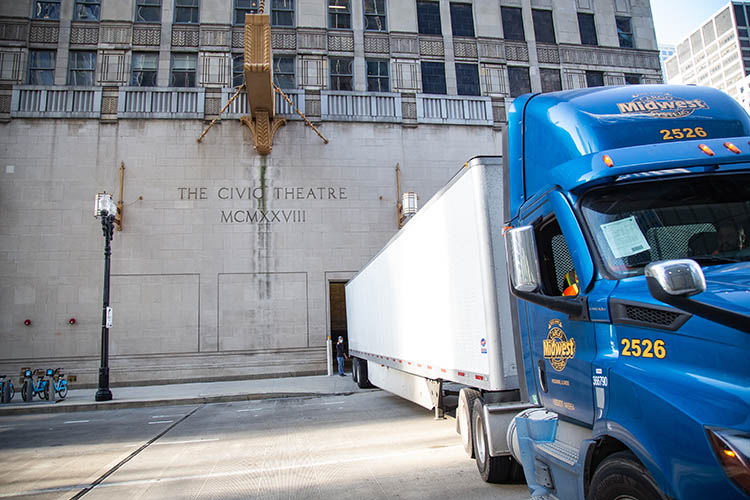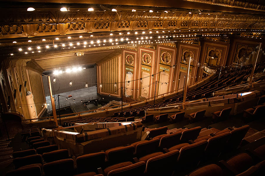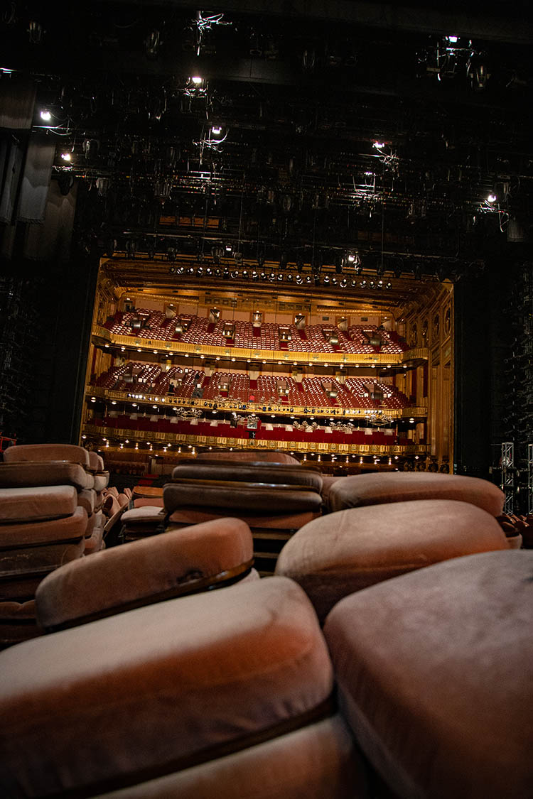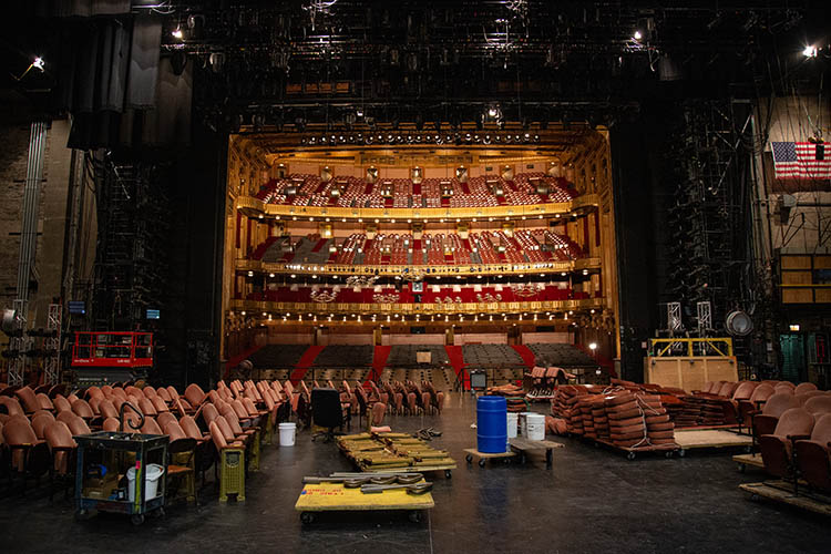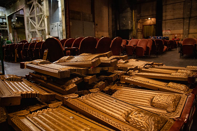 As soon as we received word that our shipment of seats was on its way to Chicago, IATSE Local 2 stagehands began removing the old seats from the main floor and balconies of the Ardis Krainik Theatre. The gilded end panels were carefully removed from each aisle seat and shipped to Series Seating’s facility in North Carolina, where they were powder coated and modified to fit our new seats. The end panels are original to the theater, and have not been touched since 1996, when they were repainted for the first time since they were installed in 1929. Originally, only every other end panel included an aisle light. The most obvious modification will be the addition of LED lights to each end panel—improving visibility and the overall safety of our walkways.