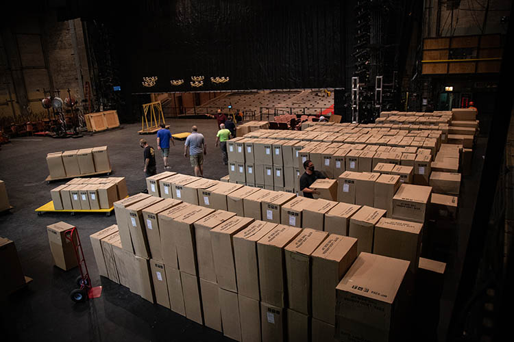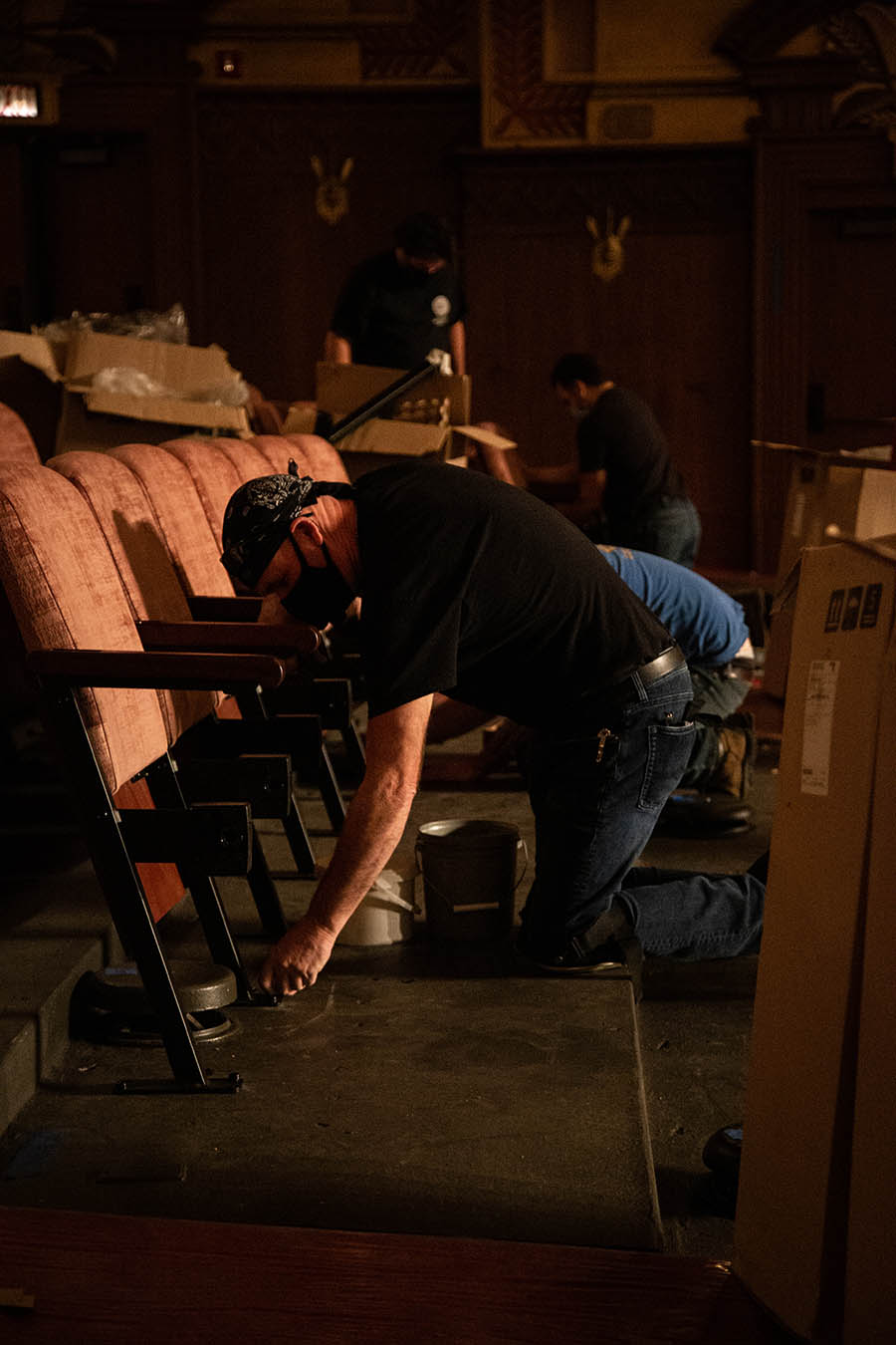 In early October, our dedicated stagehands, assisted by a crew from Series Seating, began installing the new seats in the balconies. As the floors were painted, and new anchor bolts were installed, seating installation moved to the main floor.
