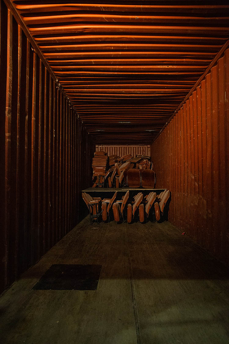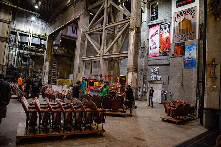More than 3,500 old seats were packed into shipping containers to be stored at our south-side warehouse until we are able to find them a new home. From the very beginning, we knew we wanted this project to be as "green" as possible. Our various vendors, suppliers, and contractors are similarly committed to sustainable construction and business practices. Most of our construction waste is being recycled or reused, and thankfully we were able to "upcycle" our existing 288 box-seat chairs. These movable seats are being completely remade by The Furniture Shop, Inc., a south-side Chicago-based artisanal furniture refurbishing, refinishing, and upholstery firm, specializing in fine furniture preservation and repair.