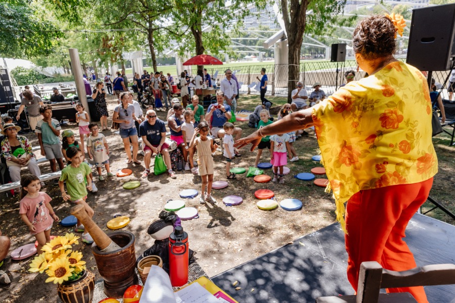 Storyteller Jasmin Cardenas gives a lively interpretation of Anholt's Frida Kahlo and the Bravest Girl in the World book to visitors in Millennium Park.