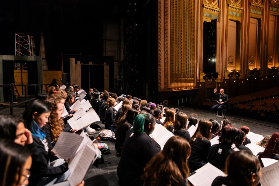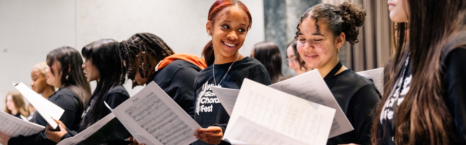 In January, 120 students involved in Lyric's High School Choir Residency program participated in the inaugural High School Choral Fest. A large-scale, collaborative effort, the festival brought together students from five schools across Chicago. From Washington Park to Lakeview, school administrators and teaching artists united around a shared love of music, dedicating a full instructional day to gather on Lyric's stage and create something truly special together.