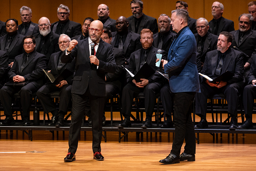 Maestro Enrique Mazzola joins Michael Black and members of the chorus for onstage remarks.