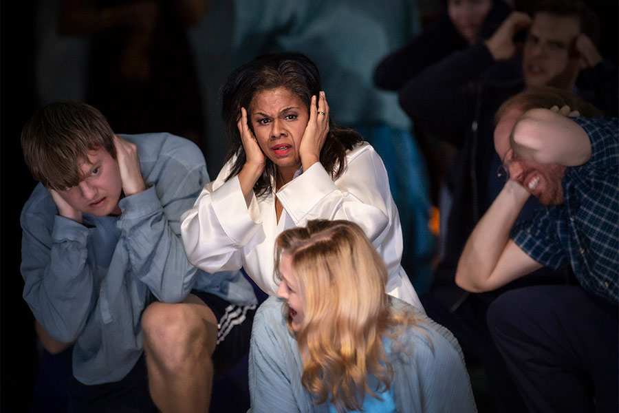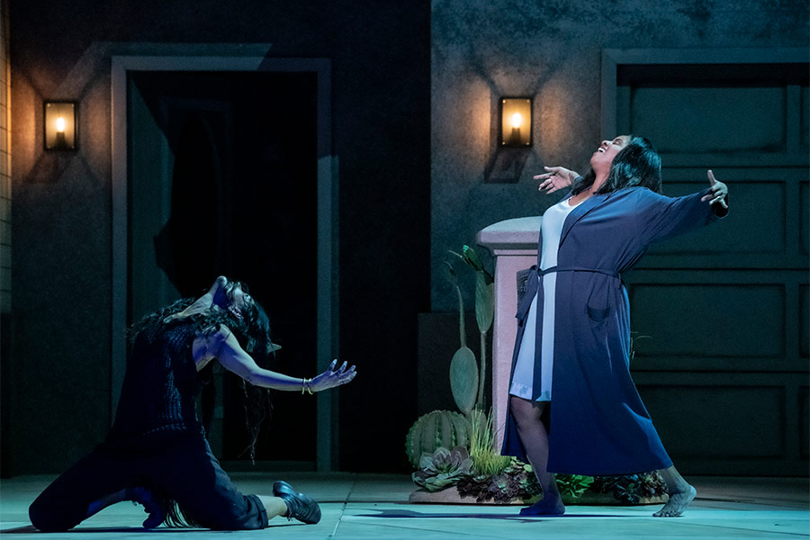 Claire Devon (Nicole Heaston) falls under the spell of a mysterious coyote (Line Tørmoen) in the world premiere production of The Listeners at the Norwegian National Opera & Ballet.