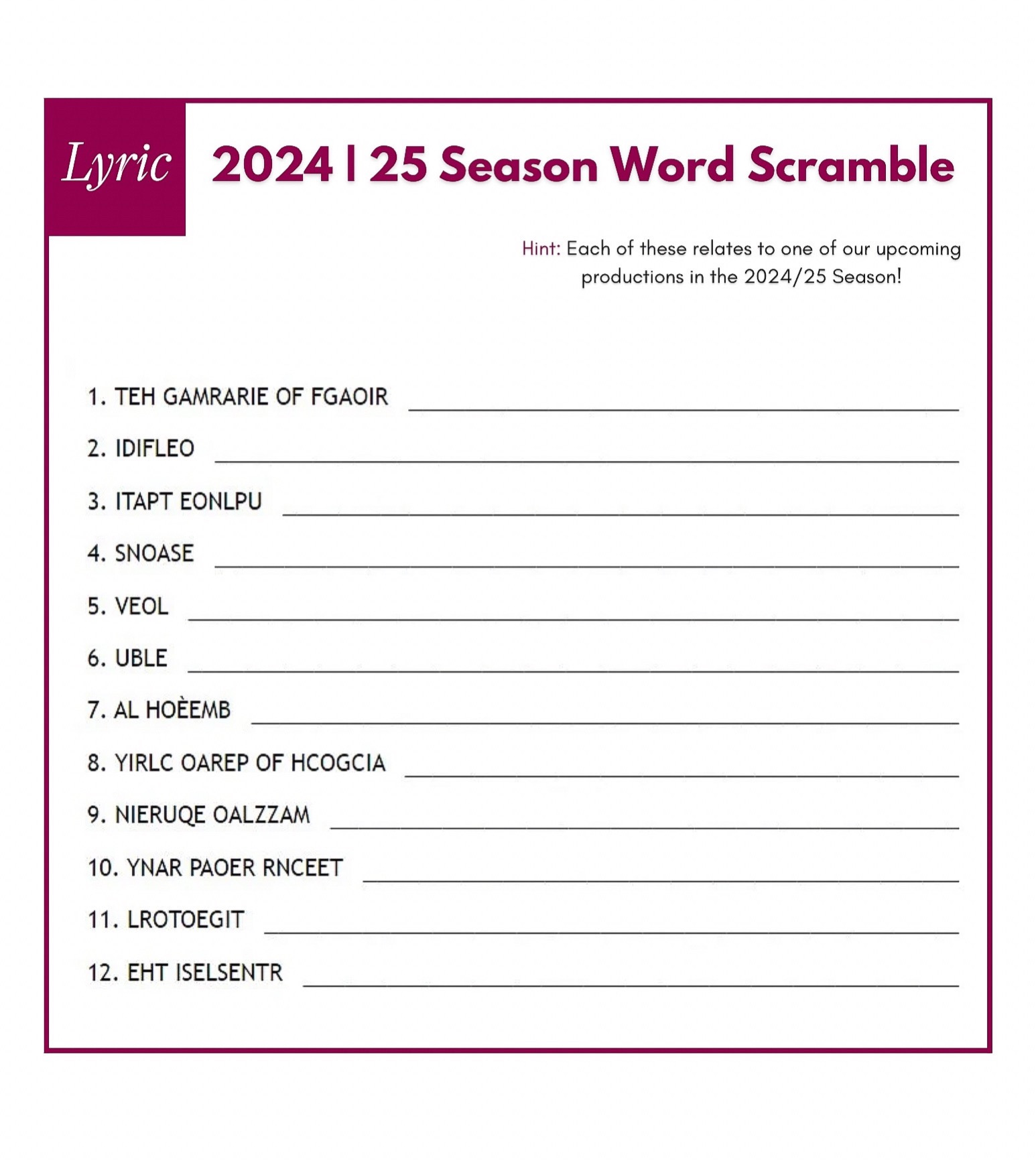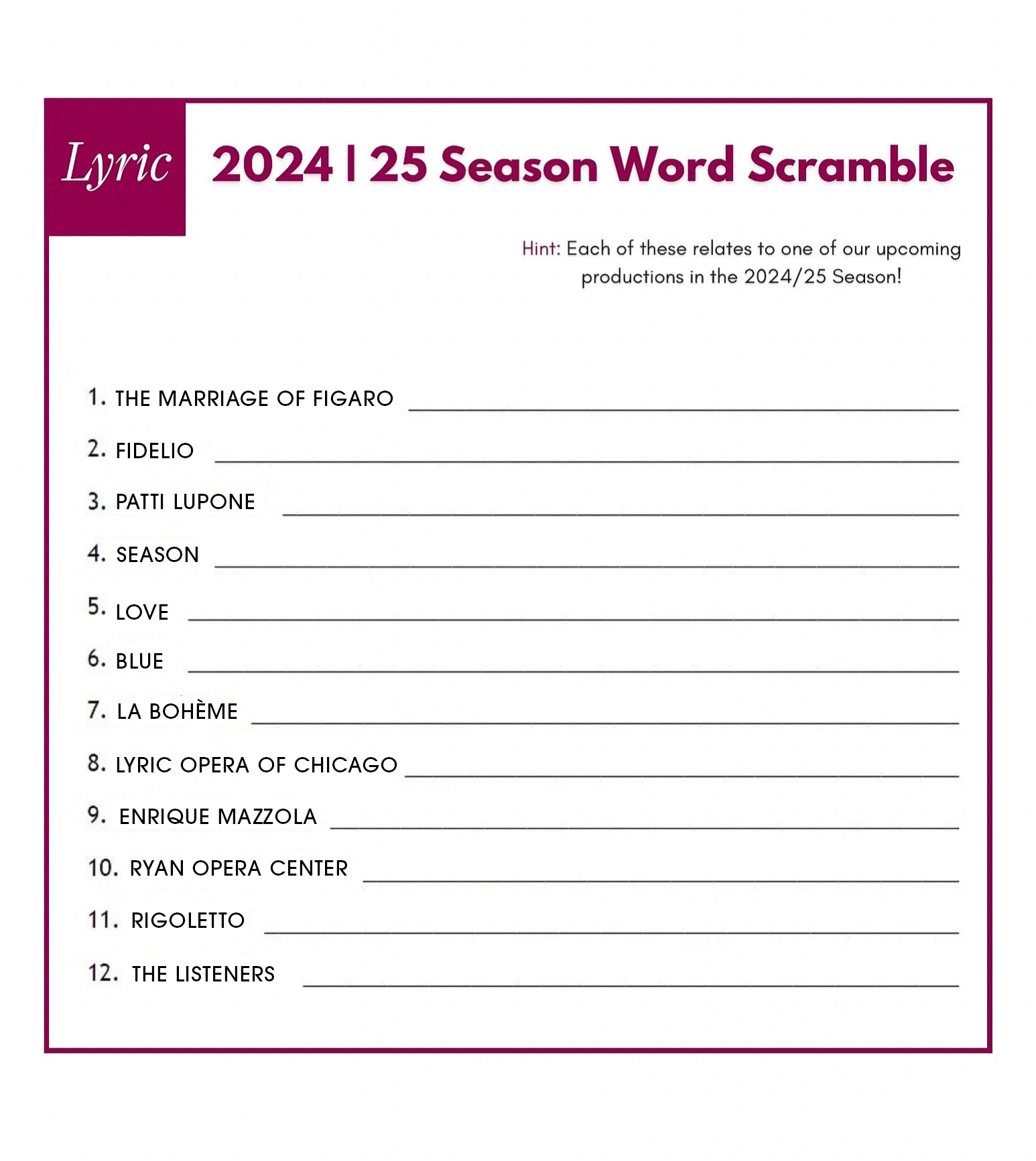 Celebrate Lyric's 2024/25 Season of transcendent voices, compelling storytelling, and grand theatrical spectacles with these fun puzzles. Each puzzle in this collection is inspired by the timeless tales and contemporary works featured in our upcoming performances. It's a perfect way to share a love of opera with friends, family, and fellow puzzle lovers, and perhaps spark a curiosity about the vibrant cultural experiences waiting for you at Lyric.